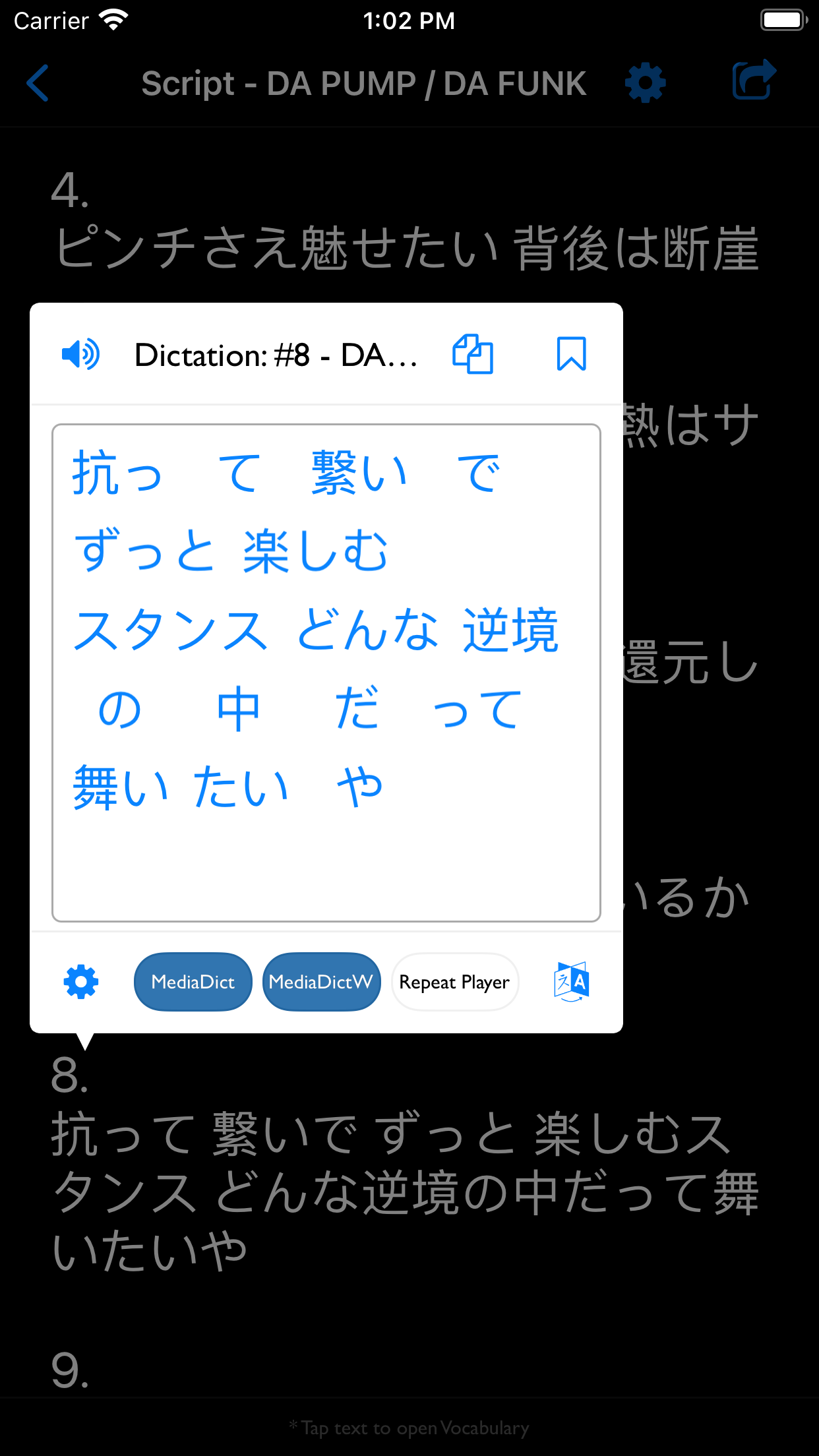 In every language, certain words are hard to hear depending on surrounding words. Identifying the words you struggle to hear accurately helps you become familiar with their pronunciation, leading to effective improvement. The “MediaDictW” menu offers dictation exercises by arranging word order, while the “MediaDict” menu provides character-by-character dictation.